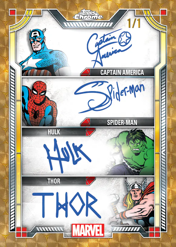 Starting with a 150-card base set, Marvel Chrome 2024 features all the iconic superheroes that helped make Marvel the No1 comic book brand on the planet. From Hulk and Thor, to Iron Man and Black Widow, they’re all there in this 150-card base set. The base also includes 1st Appearance cards, plus 14 different parallels to chase, including a Spider-Web refractor, a Human Torch refractor, and of course, the iconic 1/1 Superfractors.