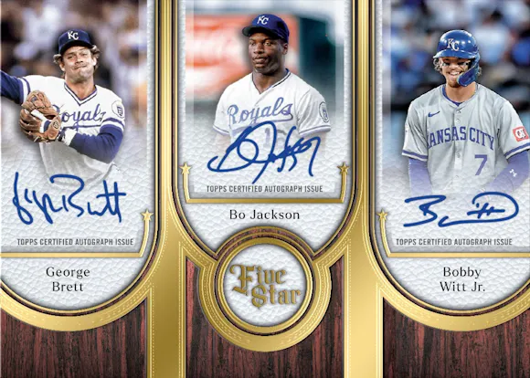 2025 Topps Five Star Baseball returns with a completely refreshed build and a premium checklist that celebrates rookies, veterans, and legends with on-card ink throughout. Each box delivers a base card numbered to 50 or less and five on-card autographs, with every autograph in the product numbered to 199 or below. Cases deliver even more to chase, including one auto relic, one acetate autograph, and one color ink autograph. The base set debuts a new look for 2025, showcasing standout talent across low-numbered color, including Orange to 25, Emerald to 15, Black to 10, Red to 5, and Foilfractor 1-of-1. Autograph relics expand the premium feel of the product with Quintuple Relic Autographs, Jumbo Prime cards, and new Dual Autograph Patch cards. Award Winner Autograph Relics highlight MVP, Cy Young, and Rookie of the Year honorees with game-used pieces, while Rookie Cap cards feature unique 1-of-1 MLB Logo Man and side-logo patches from celebrated in-season hats. Five Star’s autograph lineup remains its calling card, offering a deep run of on-card sets. Collectors can chase Five Star Base Autographs, Dual and Triple Autographs, and new themes like Quotable, Stars and Stitches, and Pre-Eminent Power. Additional premium sets include Five Tool Phenom, Five Time Signatures, and Baseball Royalty Autographs, plus signature styles like Golden Graphs and Silver Signatures. Shadowbox favorites such as Pentamerous Penmanship, Leaping for the Stars, and Field Access add dramatic presentation. The chase reaches its peak with 1-of-1 Cut Signatures, Celebrity Cuts, and Welcome to the Club, pairing Clayton Kershaw with fellow members of the 3,000 strikeout club. All sales are final. Art subject to change. Not responsible for typographical/printer errors.